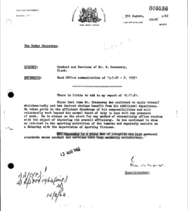 “…Mr Greenaway has continued to apply himself, He takes pride in the efficient discharge of his responsibilities And will voluntarily work beyond his normal hours of duty to cope with any pressure of work. He is always on the alert for any method of streamlining of his routine with the object of improving its overall efficiency.