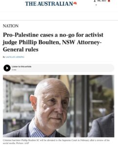 Phillip Boulten, a criminal barrister elevated to the NSW Supreme Court despite a history of criticism of Zionists and police, will primarily handle common law and murder cases, NSW Attorney-General Michael Daley says, in an effort to avoid any “apprehension of bias” in matters related to pro-Palestine protests or demonstration laws. That’s the flimsy defence for Boulten’s elevation.