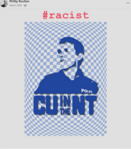I am not at all assured by the Attorney-General’s assurances, given the unbridled hate Boulten has demonstrated for both Israel and police. Below is from his social media feed, a rendering of a policeman with a nasty caption.