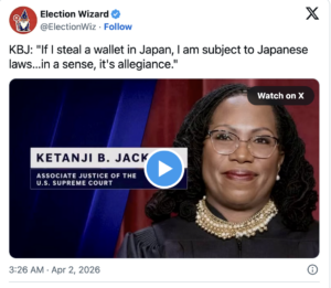 But never mind Chief Justice Roberts, the cake in common sense deficiency was taken by his colleague who can’t define a woman, Ketanji Brown Jackson, who really did say during that oral argument: “I was thinking, I, a U.S. citizen, am visiting Japan. And what it means is that if I steal someone’s wallet in Japan, the Japanese authorities can arrest me and prosecute me,” Jackson began. “It’s allegiance, meaning can they control you as a matter of law.”
